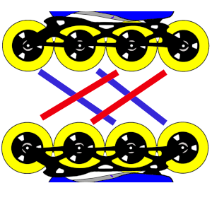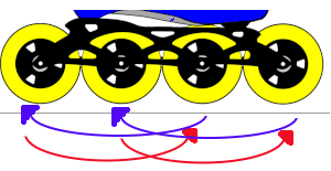 Wielen slijten onevenredig af. Door de wielen regelmatig te wisselen kun je de slijtage min of meer plannen. Er zijn verschillende wisselschema’s mogelijk, je ziet hieronder 2 afbeeldingen waarbij in de eerste afbeelding de 2 voorste wielen naar achteren en de 2 achterste wielen naar voren gaan. Bovendien worden de wielen gedraait zodat de draairichting verandert. Bij de 2e afbeelding worden de wielen van de ene naar de andere skeeler verplaatst. Hierdoor blijft de draairichting gelijk.